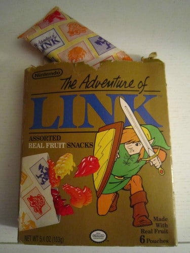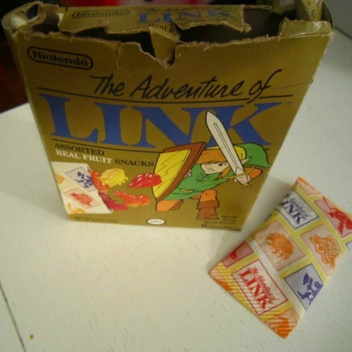 It’s one of the many examples of 1990’s licensing, where Nintendo pimped their franchises out to anyone with enough cash. Thomas J. Lipton Co. marketed these Nintendo Real Fruit Snacks and this example, was made to resemble the Zelda 2 NES release.