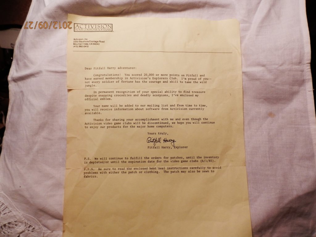 Activision Explorers’ Club ORIGINAL AWARD MEMBERSHIP LETTER FOR PITFALL