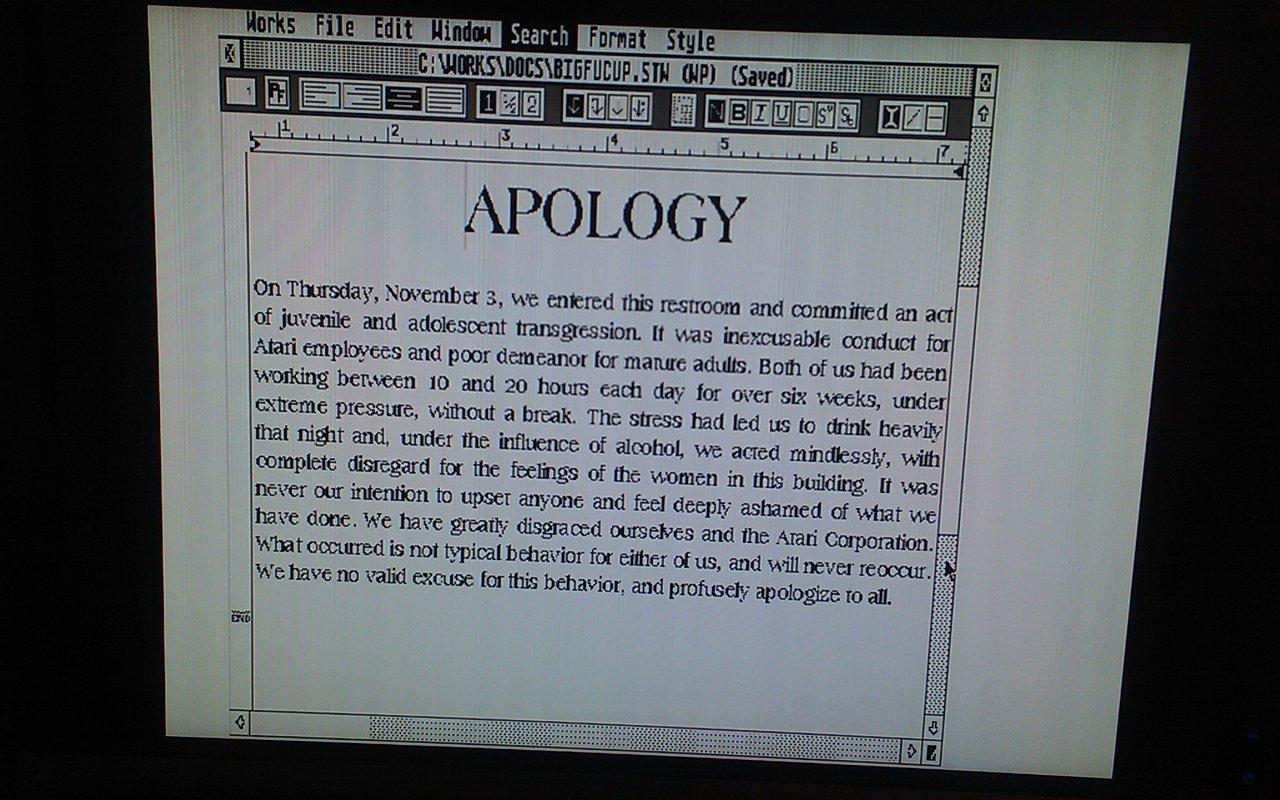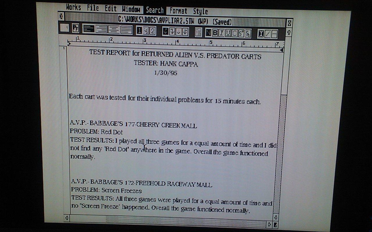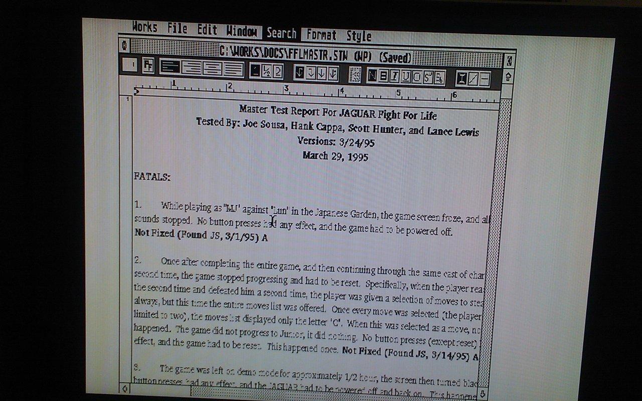 Now for the kicker. This machine appears to be either Hank Cappa’s, or Joe Sousa’s machine while he worked at Atari in the early to mid 90’s. They were both members of the Atari Test Department! On the hard drive are what appear to be tons of test related files and documents from the Atari Lynx and Jaguar days. There appears to be a full Jaguar development kit on there also. We frequently had to download ROMs to the Jag with the TT and an Alpine board. Look for the picture below involving the “JAGBIN” directory. The documents on this machine appear to be mainly various flavors of test reports or related docs. There are some other interesting documents in there such as Aliens vs. Predator level object layout docs, and a strange “Apology” document. Check some of the many screenshots below. If you would like me to take pics of anything specifically from the machine please let me know and I would be happy to do so.