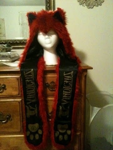 At the 2010 E3, Nexon gave away these beautiful Red Wolf Spirit Hoods to promote Vindictus. Only 500 were made, all of which went to the first lucky people to snag them that night! It was the most coveted piece of swag at the event. My fiance was one of the first people to get one, and had people offering to pay him $500 for it (he wanted to bring it home for me, isn’t he sweet!?). This is super collectible and will continue to raise in value! Spirit Hoods are soft, furry hats in the style of different animals, with long scarf-like arms and little pockets behind the paws. This never-worn Spirit Hood is a Red Wolf, to honor one of the main characters in Vindictus, and was specially designed for E3.