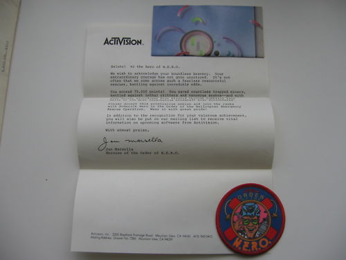 Atari 2600 Hero Patch & Letter – Up for bid is an Activision HERO game patch and high score letter in like new condition. It was mailed to me in the 1980s. Auction includes Order of the H.E.R.O. patch, the original letter from Activision, and Activison game catalog. The patch has never been used or worn and still has the heat seal instructions on the reverse side.