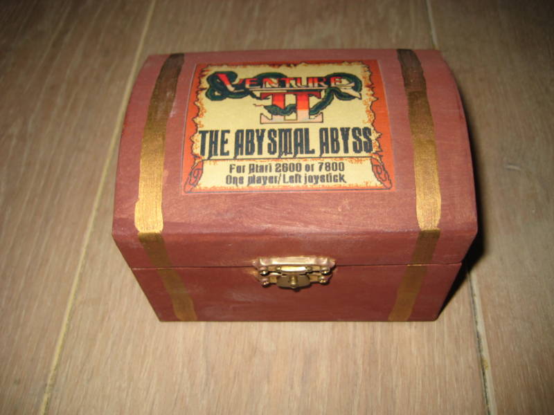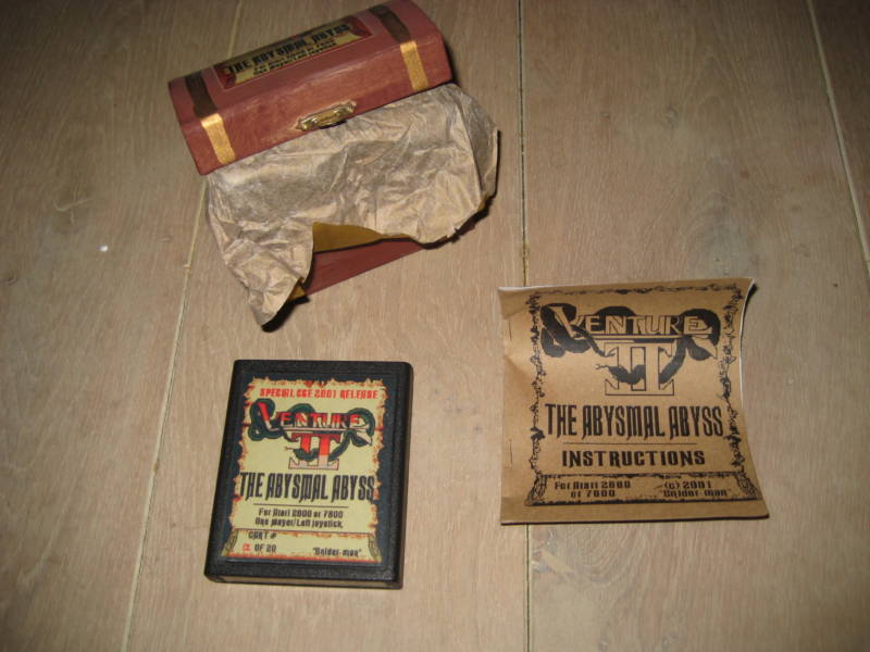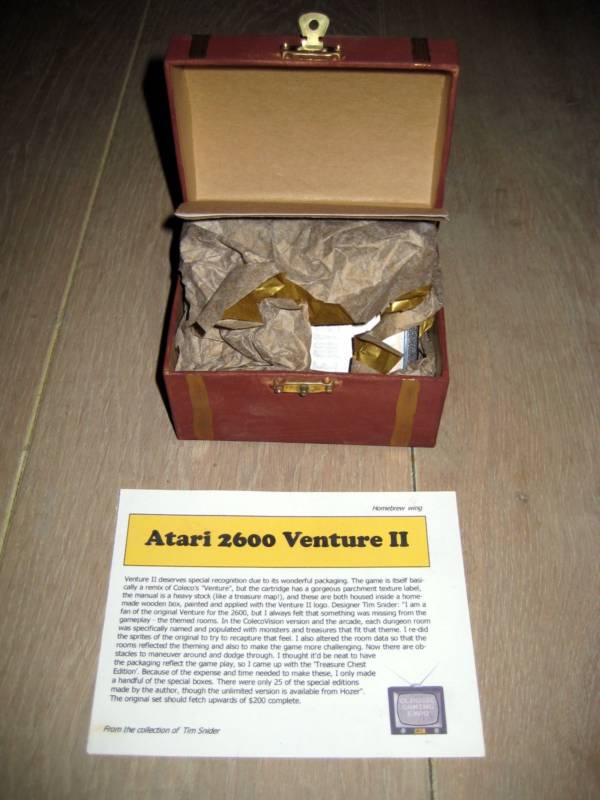 Venture II was created by Tim Snider as a sequel to the classic game Venture. Only 24 copies of Venture II were produced. The first four carts were part of a pre-production run so Tim could get the manufacturing process fine tuned. Those first four are marked with Greek letters on the label. Tim then created 20 numbered copies of Venture II which he made available privately at the 2001 Classic Gaming Expo. One copy of Venture II sold at the CGE2K1 auction and went for over $200. Tim created perhaps the most extravagant packaging seen for a self-published title at the time–the game was delivered in a hand-crafted, miniature treasure chest, which opened to reveal the cartridge (with numbered label) and a manual, surrounded by elegant, gold leaf paper.