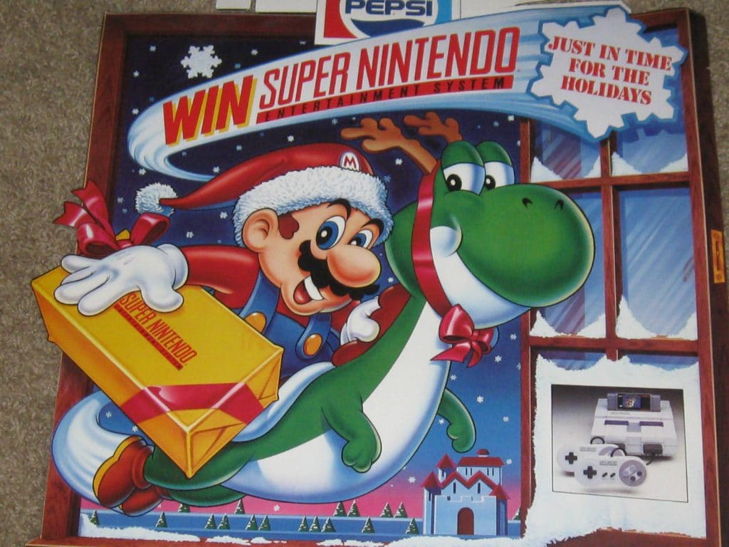 1991 SUPER MARIO NINTENDO PEPSI STORE DISPLAY SIGN  – Pepsi and Mario unite in yet another ad, this one featuring a contest with a Super Nintendo as a grand prize