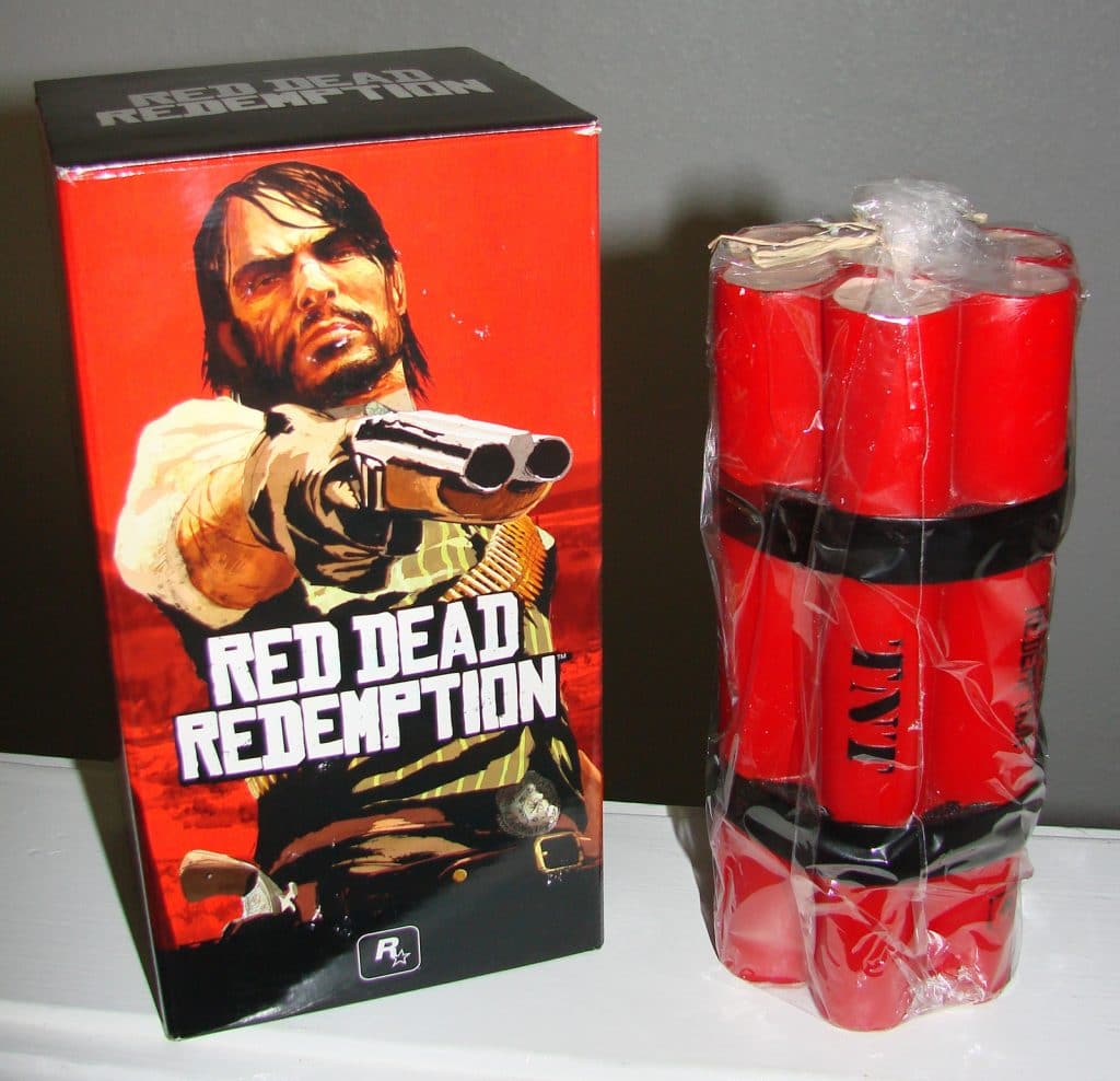 Red Dead Redemption TNT Dynamite Candle – A… dynamite candle? One of the more outlandish video game promo items in recent memory. Explosions are probably not included