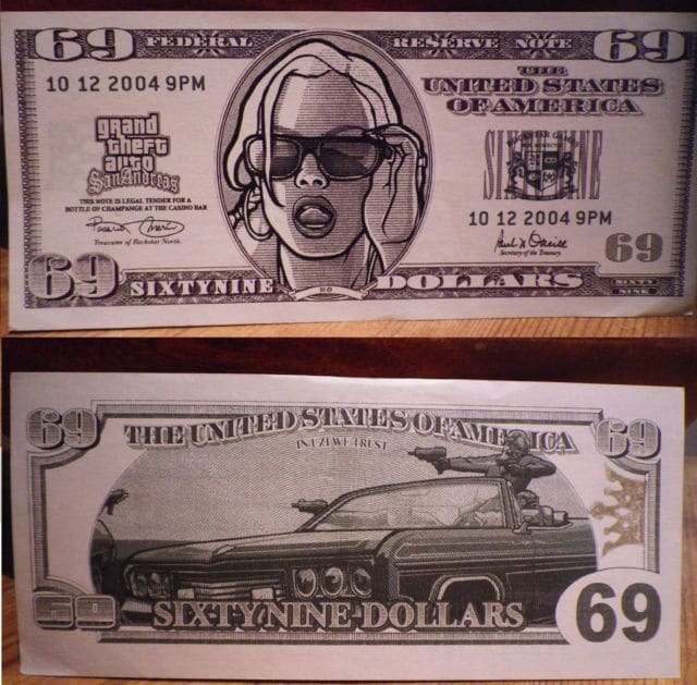 Grand Theft Auto $69 Dollar Bill – These bills were distributed at the wrap party to celebrate the completion of work on Grand Theft Auto: San Andreas, and were exclusively handed out to employees of Rockstar North. The front face of the note depicts a typical GTA: San Andreas “Ho”, while the rear face depicts a “drive by” and the slogan “In Uzi we trust”. The bills are dated “10 12 2004 9PM” and entitled the bearer to a bottle of champagne at the bar. Only 100 of these notes were ever printed and most ended up ripped by the staff at the venue to avoid re-use.