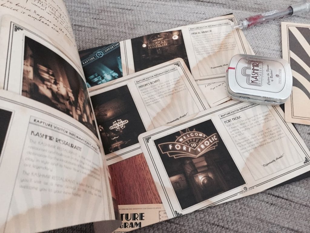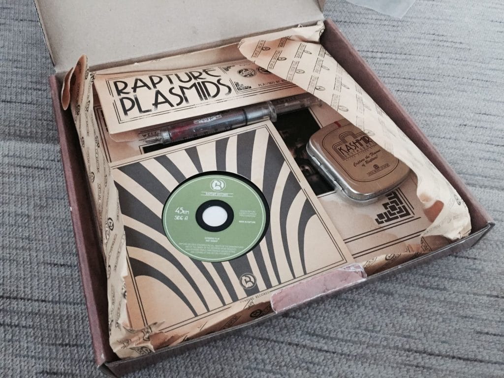 Obviously, this is intentional. But, the seller listed some minor wear due to storage of the item. Inside the box is a booklet, a syringe pen, after dinner mints, a CD that looks like an old 45 record, and your very own Rapture Plasmids. This kit just oozes classic early 60’s Kennedy era style and I love it for that.