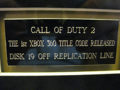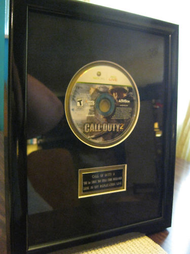 It is a framed copy of a COD 2 Disc (360) and a plaque which reads: