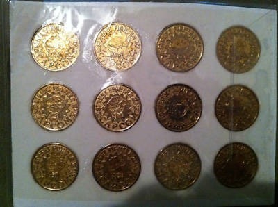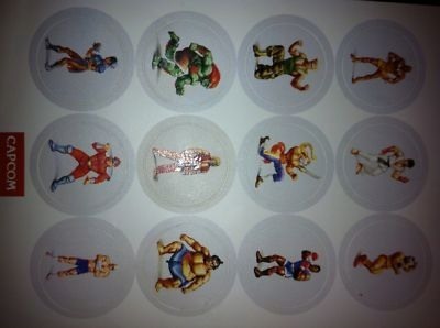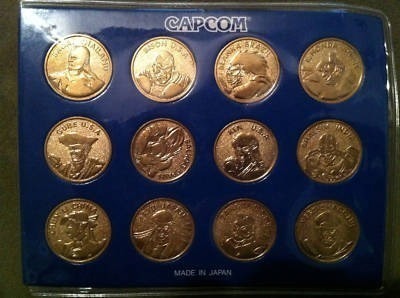 Street Fighter 2 collectible coin set by Capcom. Made in Japan. The game characters whose images, names, and countries of origin appear on the coins are Sagat, Bison, Blanka, E. Honda, Guile, Balrog, Ken, Dhalsim, Chun-Li, Ryu, Zangief, and Vega. These twelve (12) coins are in mint condition; they have never been removed from the original soft plastic sleeve. The cardboard piece that holds the coins is slightly bent in one of the corners. Also included is a 7 1/8″ x 9 1/2″ sheet of twelve (12) stickers/decals featuring the characters from the game.
