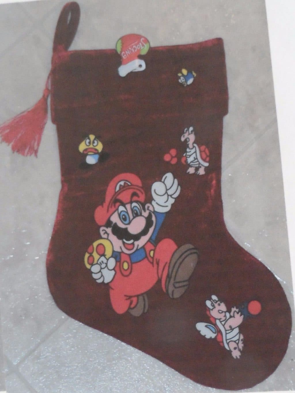 - SUPER MARIO BURGUNDY CHRISTMAS STOCKING NINTENDO VIDEO GAMES – BURGUNDY velvety Christmas stocking featuring Super Mario. Measures 18 inches long and 9 1/2 inches wide at foot.