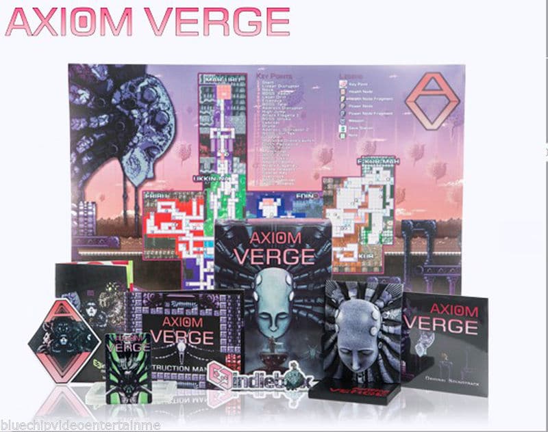 - Axiom Verge Limited Edition PC, Mac, Linux 2013/3000 – Listed for $149.99, this limited edition includes: box as well as Steam key, color manual, USB cartridge with DRM-Free version of the game, soundtrack on CD, Elsanova Statue, full color world map, and sticker.