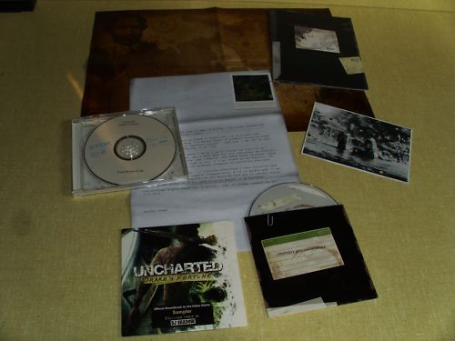 Uncharted Drake’s Fortune 2007 PS3 Press Kit – Press kit comes in a book shape boxed that looks like a diary and opens up like one. Under a couple of pages, the box hollows out and included inside are a letter, a map, a booklet, a postcard (with holes to help decode “secret messages”), a disc labeled “press disc” (comes in a black slip case labeled “property of Nathan Drake”), an official soundtrack to the video game sampler CD from DJ Shadow, and then one more disc in a TDK case labeled “Uncharted: Drake’s Fortune – Final Review Code”.