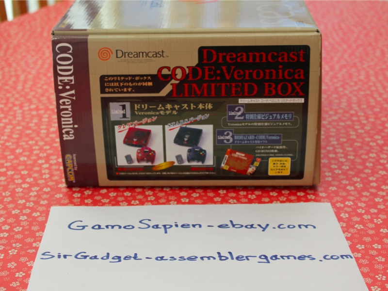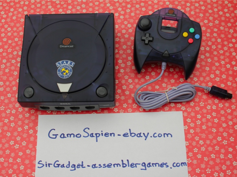 This is a limited edition Resident Evil Japanese Dreamcast released around the time of the Biohazard Code: Veronica launch. It was available in two versions, a Claire Redfield model and VMU, and the other a clear dark blue S.T.A.R.S model and VMU. The first was limited to 1800 pieces and the later to a mere 200.