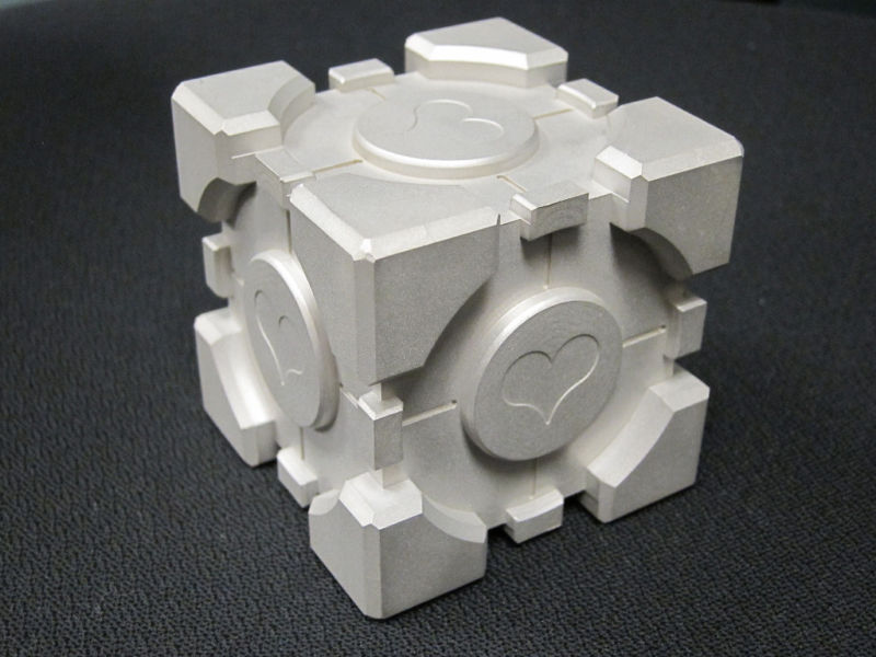 Portal Custom Metal Weighted Companion Cube Paperweight – Acording to the aution fewer than 20 of these were custom made and given to the developers. The cube is milled from a solid block of what appears to be aluminum. It is not painted, measures 3″ x 3″ x 3″ and weighs exactly two pounds.