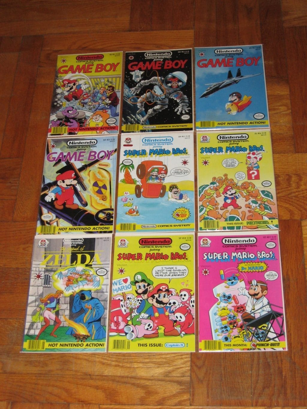 Nintendo Comics system comic books issues #1 to 9Â – Issues 1 through 9 of Valiant’s first Nintendo-themed comic, Nintendo Comics System. This particular set is an odd duck in that it didn’t cover one particular franchise, jumping around issue to issue. Valiant did publish dedicated Captain N, Super Mario Bros., and Legend of Zelda comics as well