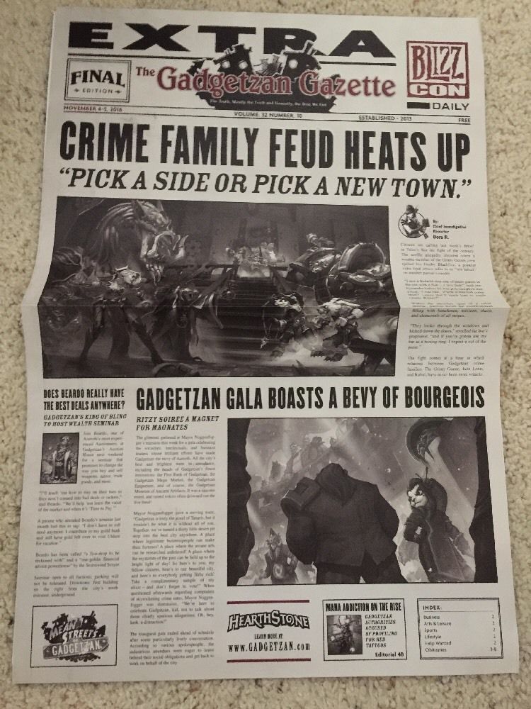 - Blizzcon 2016 The Gadgetzan Gazette Hearthstone Newspaper Poster Print RARE – Two of these are available, but people are keeping an eye on them. Only $11 and free shipping.