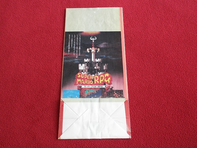 Rare Super Mario RPG Japanese Retail Bag from 1996 – Japanese retailers commonly use bags with advertising on them as a way to promote items they carry and as a way to earn extra revenue from advertisers. This particular bag was meant to promote Super Mario RPG. It’s difficult to find official Super Mario RPG merchandise aside from the game itself and a handful of strategy guides.