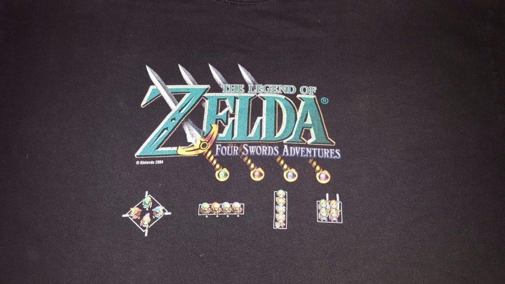 - RARE VINTAGE NINTENDO 2004 LEGEND OF ZELDA FOUR SWORDS ADVENTURES T SHIRT NICE L – Make sure you snap this bad boy up! It’s one of the more hard to find shirts on the ‘bay! Hard to find them in this size too! The price isn’t half bad to boot.