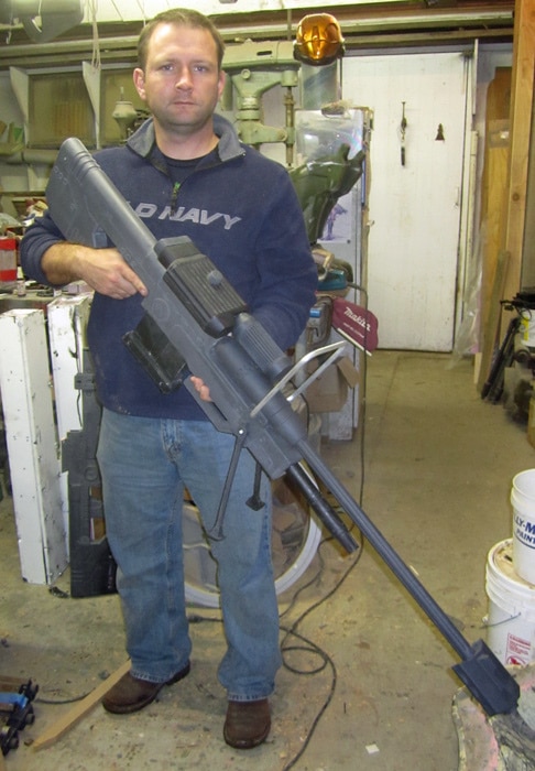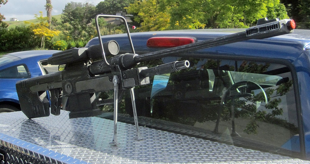 Up for sale is a lifesize replica of an SRS99D Sniper Rifle modelled after the one seen in Halo 3. It’s a fan-made prop replica made of plastic reinforced with aluminum rod and galvanized steel conduit as needed for strength. It’s actually scaled to just over five feet long instead of the 6’2″ called for in the game references. Five feet is still huge.
