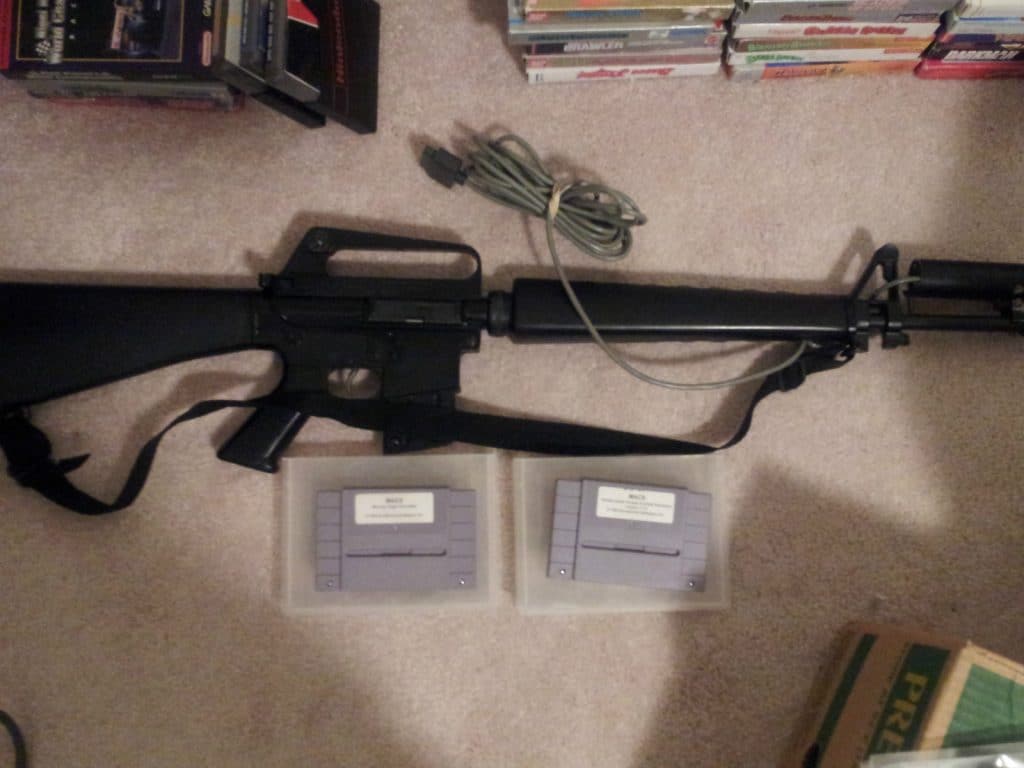 The M.A.C.S. were designed by the Military to train soldiers in bootcamp back when the Super Nintendo was in its heyday. The gun was essentially a real M16 (actually a Jäger AP 74 – a M16A2 clone), only stripped down and modified to work with a specially designed game cartridge. The gun itself is far more accurate than the Super Scope and has an authentic weight and feel. It still has sights for aiming, and the light sensor is within the barrel.