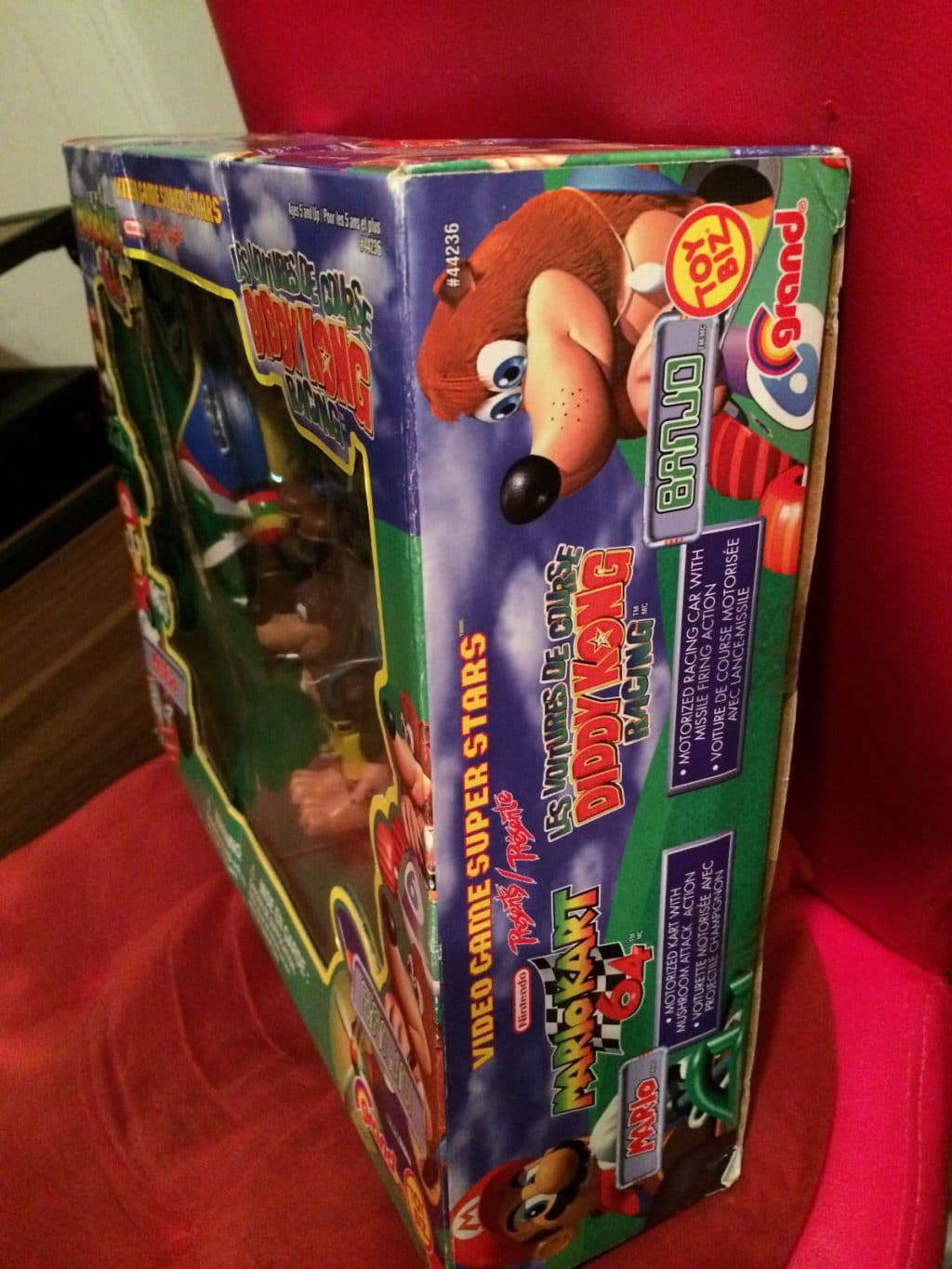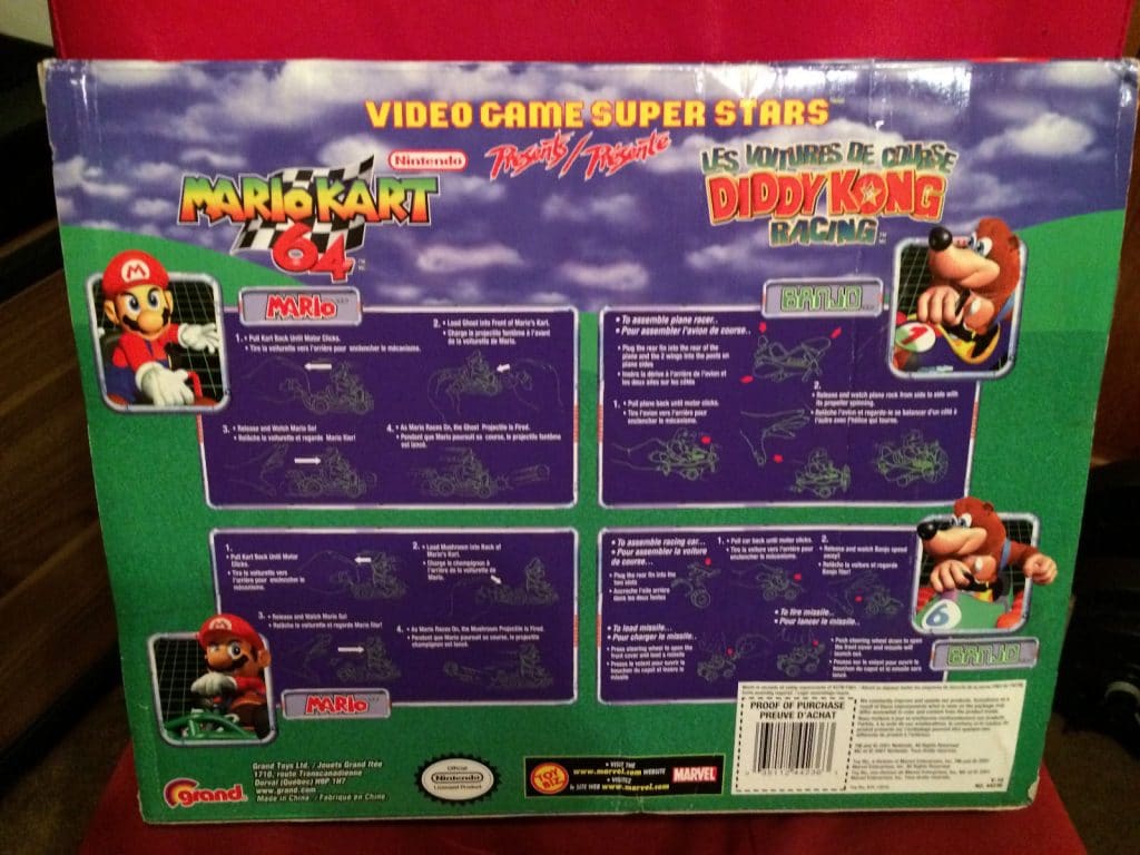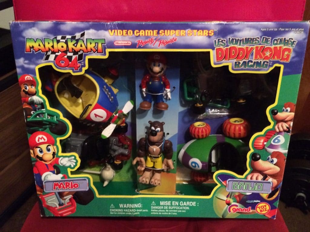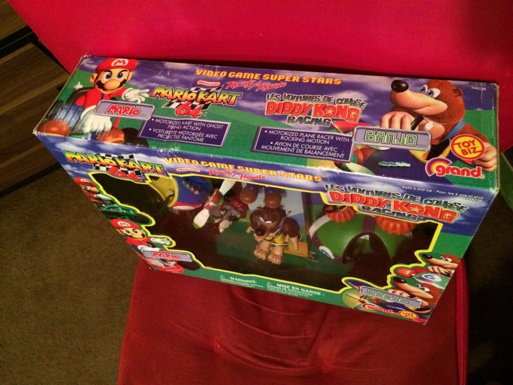 The set includes Mario and two motorized vehicles from Mario Kart 64 and Banjo and the plane racer and race car from Diddy Kong Racing. I’ve seen a few these items around individually (Luigi, Wario, Donkey Kong). Unboxed, used figures sell pretty cheap ($1 – $5). The individual figures still in their boxes typically sell around $100 and up. This is a complete set in the original box. It’s never been removed from the box and there’s only some minor wear on the box itself. Obviously, condition of the figures pictured below are new.