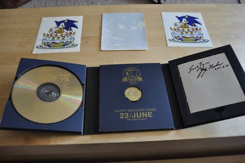 Sonic The Hedgehog 10th Anniversary signed by Yuji Naka – Released in 2001 as a pre-order bonus for Sonic Adventure 2 for Dreamcast it includes a gold color CD feature select soundtracks from various Sonic games, a history booklet, and a collectible gold colored medal, all inside a collectible tri-fold container. The history booklet was signed by Yuji Naka on 06.28.2001.