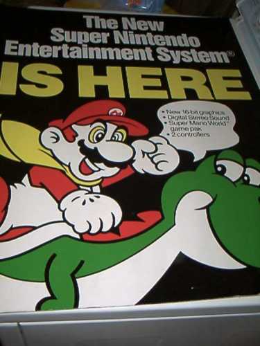 Store display poster announcing Super Nintendo SNES system with Mario and Yoshi