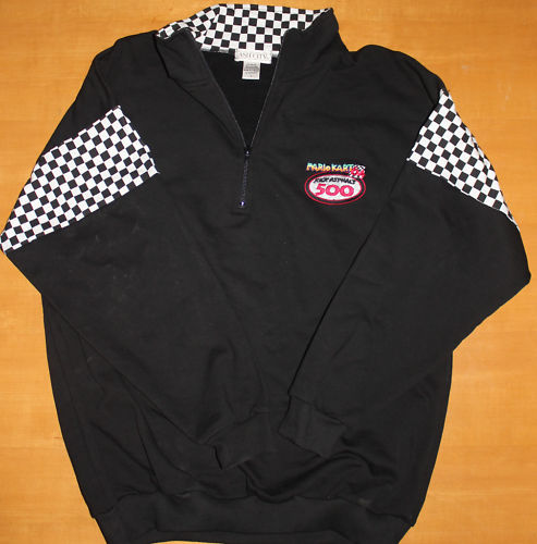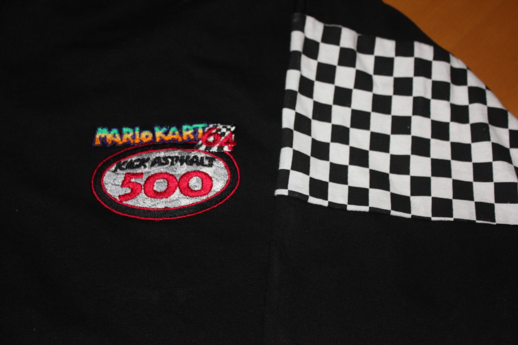 This is a very rare jacket from a sweepstakes promotion Nintendo did in 1997 when Mario Kart 64 was released. A contest was held by Nintendo called “Kick Asphalt 500 Sweepstakes”, it was one of those ‘send in a piece of paper’ things that you never expect to hear back from. In the commercial, you can see you could win a go-kart, a Nintendo 64, and “other tough stuff”. Right at around 0:19-0:20 you can see a pic of the jacket.