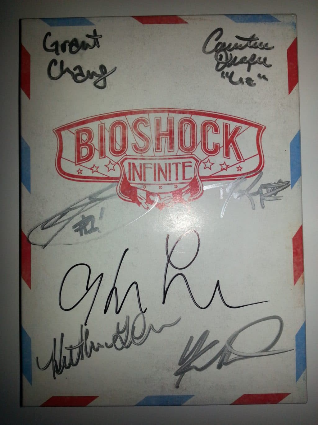 Bioshock Infinite Mind in Revolt Book Autographed New/Sealed – So I had the great pleasure of being one of many that attended the Bioshock Infinite launch event that went down at the Universal CityWalk in Los Angeles. I also happened to be the first in line at said event and because of this I was given a mysterious envelope by an Irrational Games rep who told me that only 5 of these were signed to be given out at the five launch events. I also found out that this copy was the only one signed by multiple Irrational Games developers and voice actors while the remaining 4 were only signed by Ken Levine. Pre-signed by voice actors Troy Baker (Booker DeWitt), Courtnee Draper (Elizabeth), Kiff VandenHeuvel (Comstock), and various developers including the man himself, Ken Levine (Creative Director/Lead Writer).