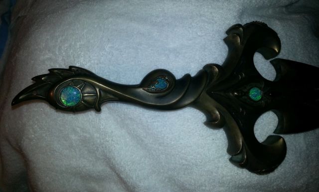 This is a one of a kind sword of mana made by a Master Blacksmith at Barrett Custom Knives. Made out of solid Bronze with encrested opal stones this sword comes with a six foot tall display case made from acrylic and wood with a stone base to hold the sword. Made by the order of Nintendo Power back in 2004 this sword was valued at 12,000$. The sword has only been taken out for inspection and the display case has never been out of its original frieght box that it was originally shipped in. Both are in mint condition and I have the original paperwork that came with them.