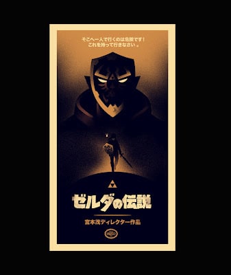 This exhibit featured over 30 artists paying homage to Link and the Legend of Zelda. This art work features Ganon peering over Link and a fairy with a dramatic movie poster style of contrast. It measures 20×36 in. and features writing in Japanese that translates “It’s dangerous to go alone. Take This.” Olly Moss added his own custom mark to the bottom in the style of the Nintendo Seal of Quality.