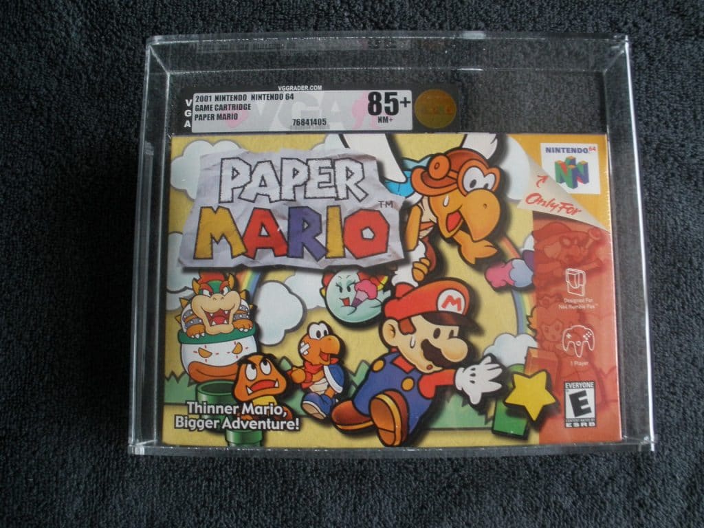 There are a few more games on this list. Yet another Game Boy classic game, Cool World. You can find the Brad Pitt movie that the game is based on all over the place; the SNES game is also pretty easy to find, there are even a few NES games out there, but the Game Boy classic game is a little tougher to get your hands on. One of the other games is a classic Nintendo 64 game called Paper Mario. This listing for the 2001 RPG has a VGA 85+ GOLD grade, is factory sealed so it’s in great shape (almost mint). Last but not least, we have a SNES CIB Space Megaforce game. A 1994 shooter game, the box for this ToHo Co., Ltd. Game shows some wear around the edges and the instruction booklet looks like the cover was folded in a couple places at some point but otherwise appears to be in good condition.