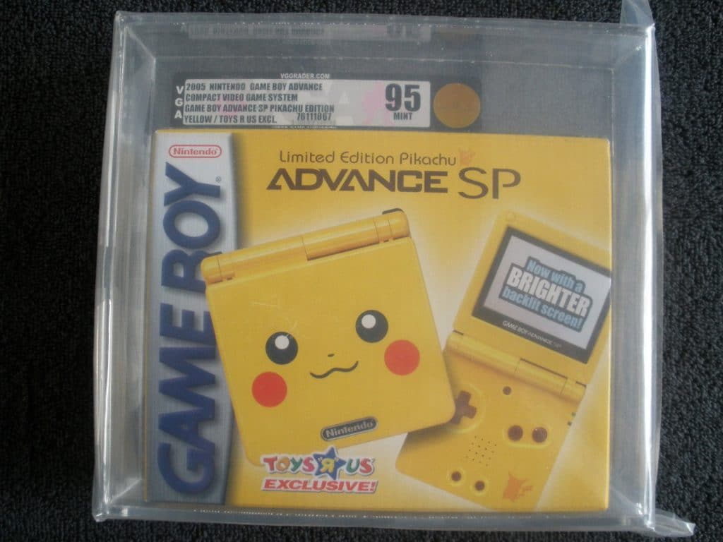 I’m going to start with one item in particular because it seems to be such a timely item. Just about everywhere you look nowadays on social media and in the world around you, you see people hunting Pokémon (and sometimes you’re doing the hunting yourself, it’s okay to admit it), so considering the Pokémon GO craze going on right now, here is a very special Game Boy Advance SP. This isn’t just any old Game Boy Advance; it is a Pikachu Game Boy Advance SP. Made in bright yellow with Pikachu’s smiling face on the front of the device, it was available in limited numbers exclusively from Toys R Us a long time ago (I wasn’t able to track down the exact year it was released). This bad boy has a VGA grade of 95 MINT, is in brand new condition, AND factory sealed. This is something you don’t see too often.