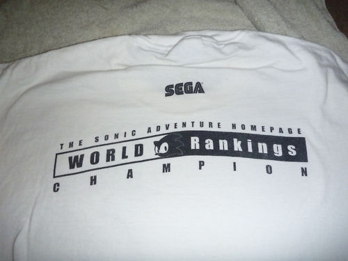This is a shirt for the Sonic Adventure World Rankings. We gave these tshirts out to the kids who won in the top 10 I think in speed trails for the launch game Sonic Adventure. They were very, very, very rare at the time but we had boxes and boxes of these at the office so a lot of employees got them. Sonic logo on the front and “The Sonic Adventure Homepage World Ranking Champion” on the back.