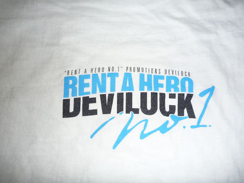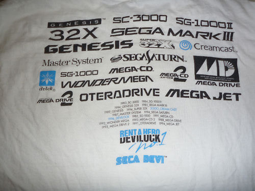 This is a rare promotional shirt advertising… I’m not sure. It seems that every system is listed on the back and a few weird ones like “creamcast”. No clue what this shirt is, I just know that a Sega executive in Japan gave it to me as a gift when I visited the Japanese offices. Has Rent a Hero #1 mixed with Devil Lock on the front.