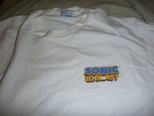 This is a shirt for the Sega Saturn game Sonic 3D Blast. We made a Genesis version and a Saturn version and this is for the Saturn. On the back it says “Alert the stars. Wake up the moon. Summon Saturn. Blue is back. Sonic 3D Blast”. 3D Blast logo on the front. I liked this one a lot and wore it a bunch but it’s in great shape.
