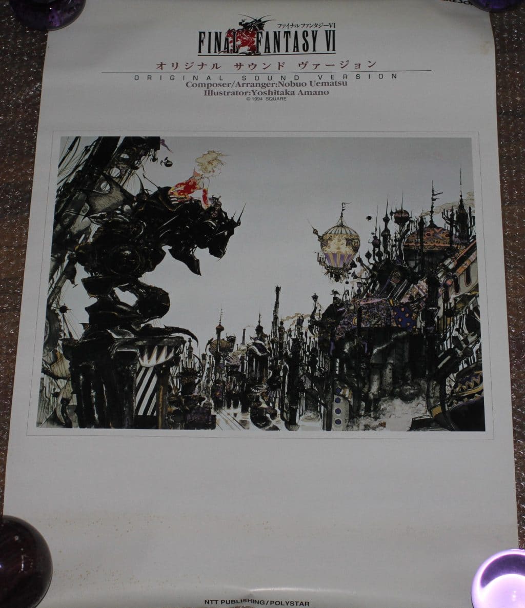- RARE Final Fantasy VI Soundtrack Promo Poster Japan: Poster measures 20″ x 29″. Used condition (slight discoloration) but the poster is rolled up, so there are no creases. The artwork is stunning. Shipping is free and it ships from Potomac, Maryland. Buy it now price is $349.99.