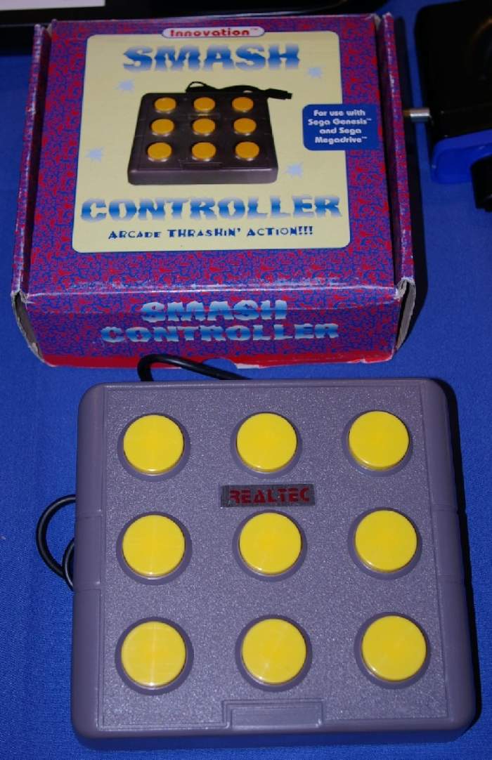 This unlicensed controller is for a game called Whac-a-Critter (on the box at least as the title screen says Mallet Legend) which is an unlicensed action game for the Mega Drive / Genesis developed by AV artisan and published in the US by Realtec in 1993. It has nine buttons for each of the holes in the game, and was distributed by Realtec and Innovation.