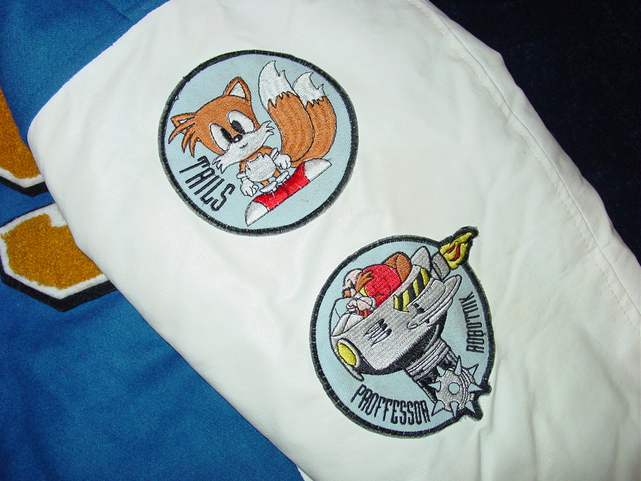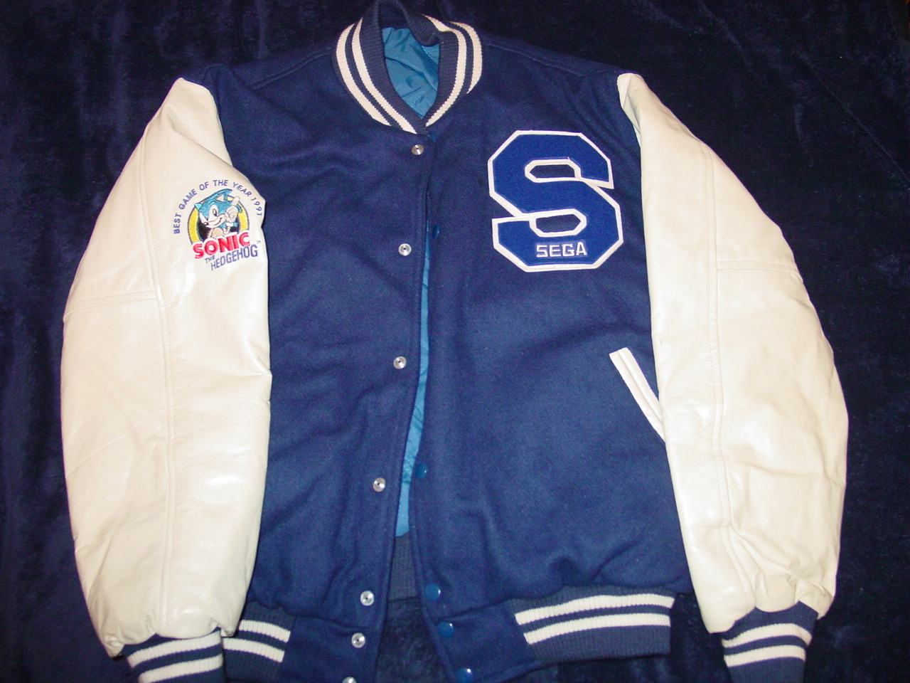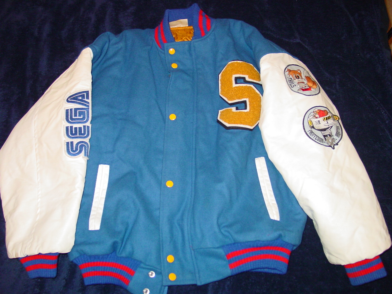 This is a promotional item that, as far as I know, was only given out to Sega employees and given away at promotinal contests back in the Genesis days. This was purchased from a former Sega employee several years ago and has been kept stored in a protective bag since then. This is a heavy, lined jacket with no marked size but similar to a “S”. For size comparison, it fit well on my 130 lb, 5’7″ nephew. Dimensions are as follows: Sleeves (from seam to end of cuff) 19″, Chest (buttoned up, from side to side under armpits) 24″, Waist (without expanding the bottom flexible side pieces) 17″. The jacket has a “Sega” clothing tab, an “S” (for Sonic I suppose, in yellow on blue) embroidery on the front left chest area, a “Sega” logo patch on the right sleeve, and a “Tails” and “Professor Robotnik” patches on the left sleeve. The back of the jacket features an embroidered patch of Sonic with his signature two fingers up and the Sonic The Hedgehog 2 font. There are six push buttons on the front and two side pockets. All of the patches and embroidery are in good condition with very mild wear on them. This particular jacket has white sleeves that have just a bit of dullness in the color, and very light internal liner or collar wear. There are no real flaws on the liner, but just a slight dull from how it would look if it was slightly worn or displayed in an open area. There are some minor creases on the sleeves (looks like leather but may be leatherette) that indicate minor use. The felt front and collar have very minimal fluffiness indicating that it was worn, but not a lot. Although this is a used collectible, it looks to be in exemplary condition especially for such a rare item. I have not seen another one of these for sale on eBay.