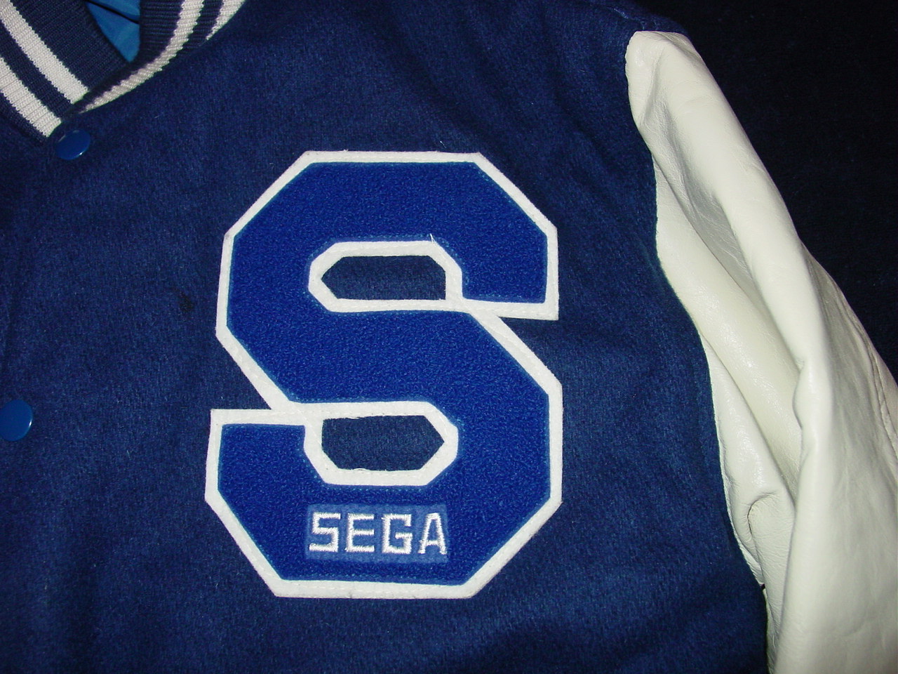 This is a heavy, lined jacket marked as size “L” but this is very deceptive as it looks closer to an “S”. For size comparison, it fit well on my 130 lb, 5’7″ nephew. Dimensions are as follows: Sleeves (from seam to end of cuff) 24″, Chest (buttoned up, from side to side under armpits) 23″, Waist (without expanding the bottom flexible side pieces) 18″. The jacket has an “Identity Inc.” clothing tab, an “S SEGA” embroidery on the front left chest area, and a “Sonic The Hedgehog Best Game of the Year 1991” patch on the right sleeve (there are no patches/logos on the left sleeve). The back of the jacket is a solid blue felt. There are seven push buttons on the front and two side pockets. All of the patches and embroidery are in good condition with very mild wear on them. This particular jacket has white sleeves that have just a bit of dullness in the color, and very light internal liner or collar wear.