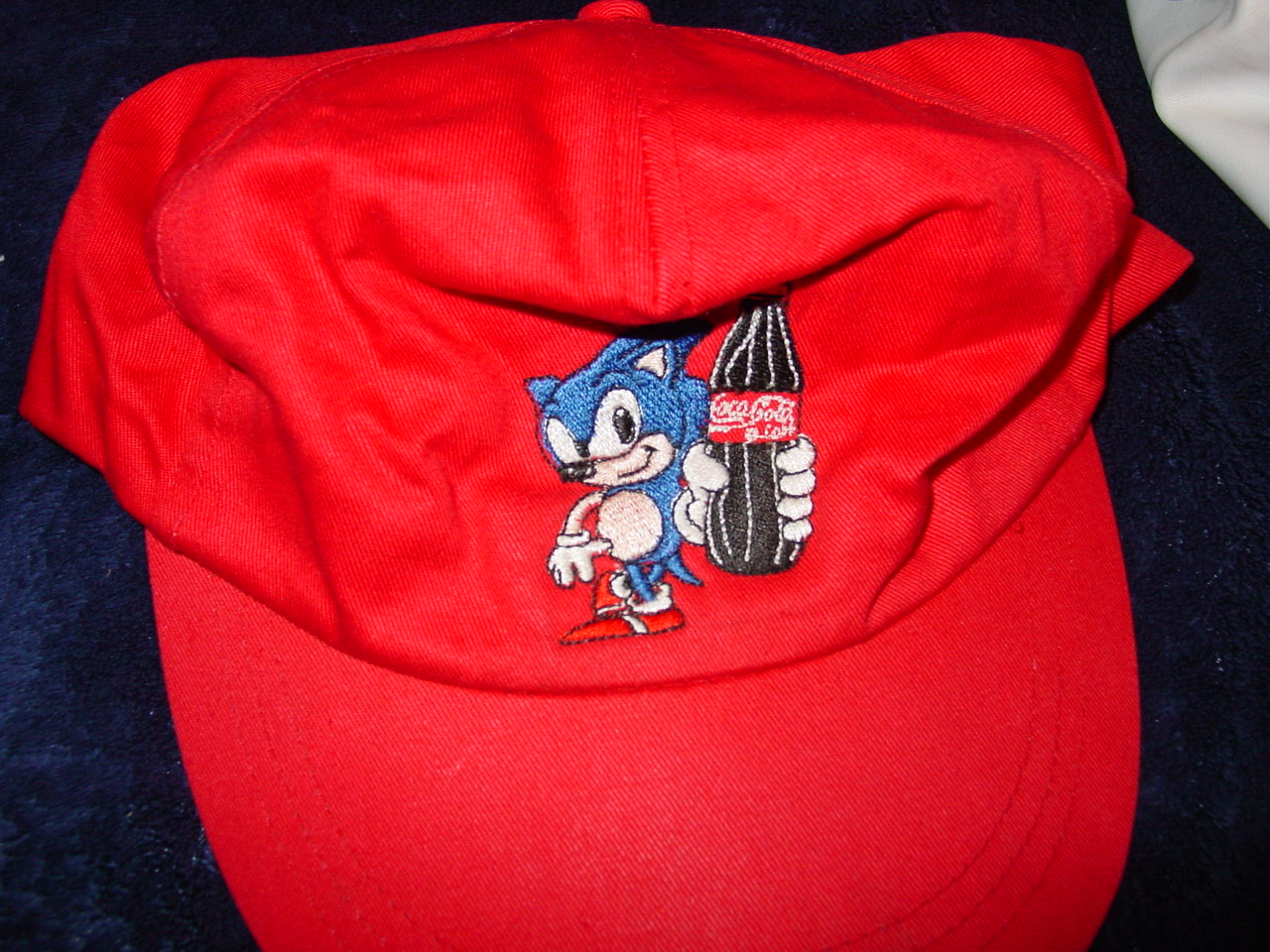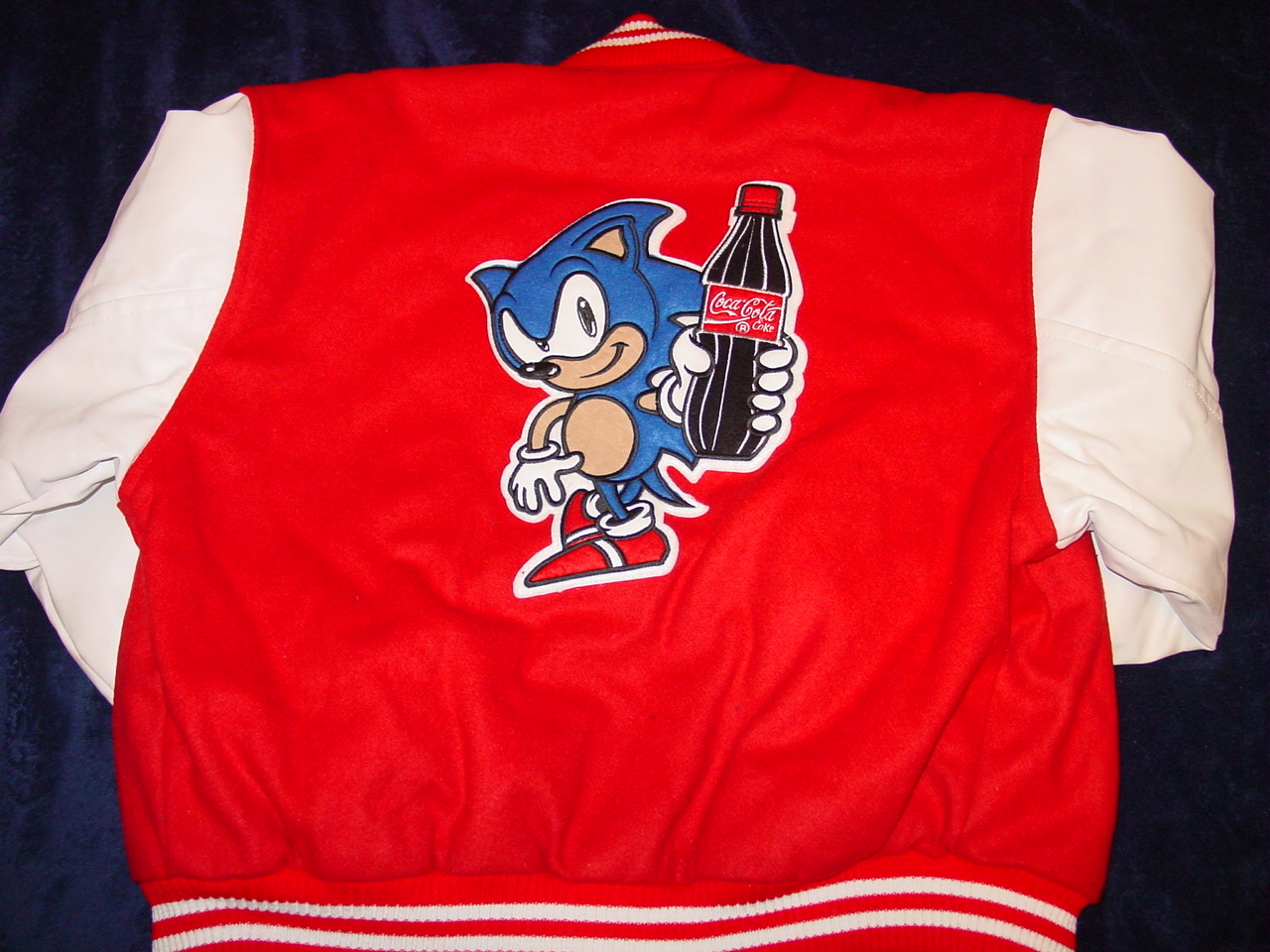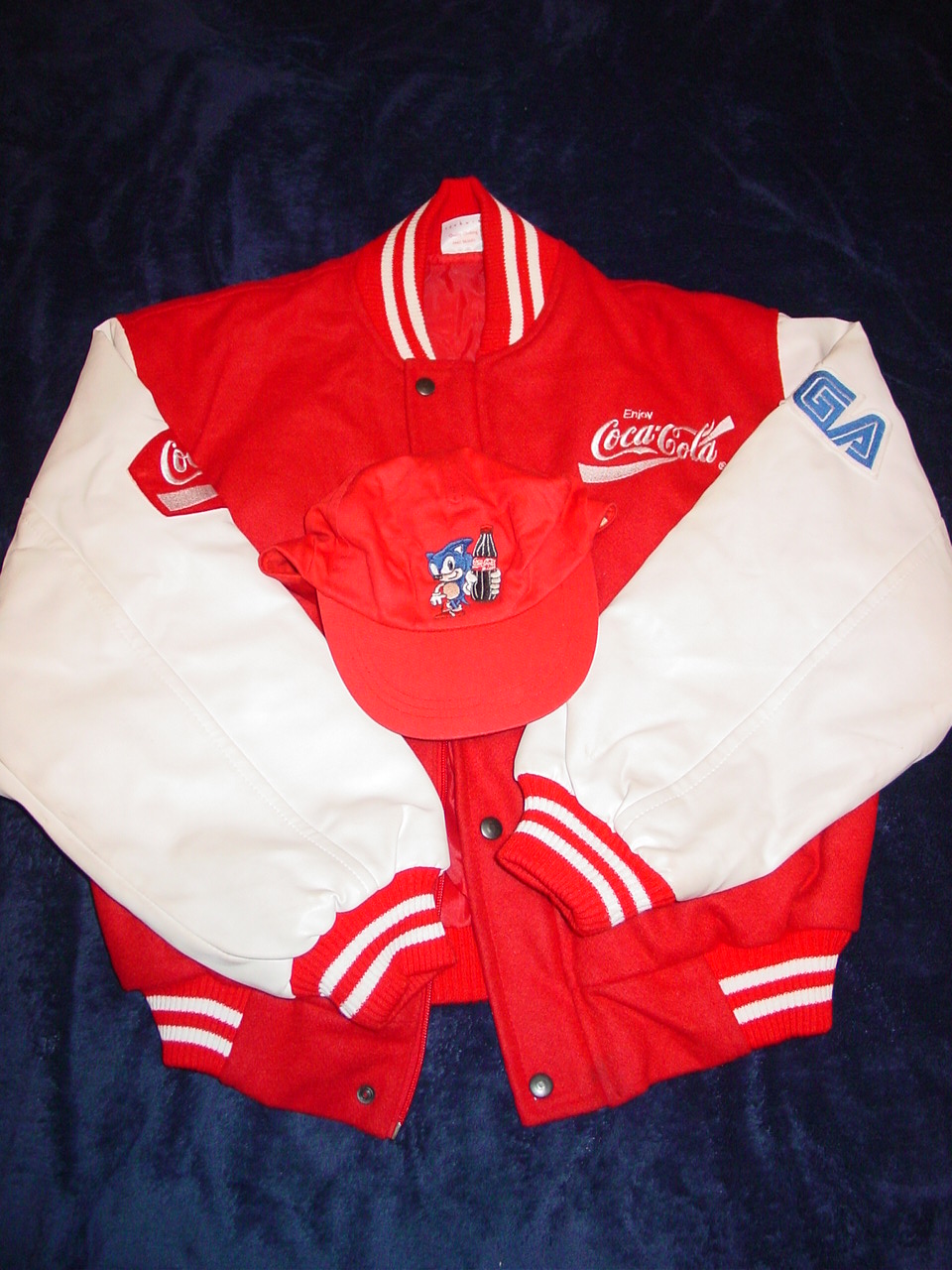 This is a promotional item that, as far as I know, was only given out to Sega employees and given away at promotinal contests back in the Genesis days. This was purchased from a former Sega employee several years ago and has been kept stored in a protective bag since then. This is a heavy, lined jacket marked as size “S”. For size comparison, it fit well on my 130 lb, 5’7″ nephew. Dimensions are as follows: Sleeves (from seam to end of cuff) 22″, Chest (buttoned up, from side to side under armpits) 22″, Waist (without expanding the bottom flexible side pieces) 17″. The jacket has a “Quality Coca Cola clothing” tab, an “Enjoy Coca-Cola” embroidery on the front left chest area, an “Enjoy Cocal-Cola” patch on the right sleeve, and a “Sega” logo patch on the left sleeve. The back of the jacket features an embroidered patch of Sonic with a Coke bottle in his hand. There are four push buttons on the front and two side pockets. All of the patches and embroidery are in awesome condition with no real wear on them. This particular jacket has extremely white sleeves, no internal liner or collar wear, and looks like it was barely worn or displayed. There are some very minor creases on the sleeves (looks like leather but may be leatherette) that indicate minor use. The felt front and collar have virtually no wear. Also included is a matching small baseball cap with a push tab on the back for sizing (I am unsure as to whether this came together as a set, or was just inclusive). Although this is a used collectible, it looks to be in exemplary condition especially for such a rare item. I have not seen another one of these for sale on eBay.