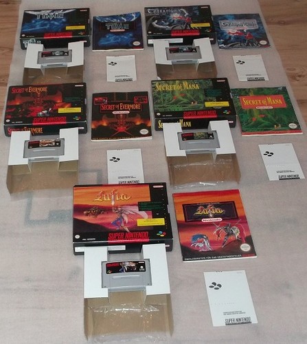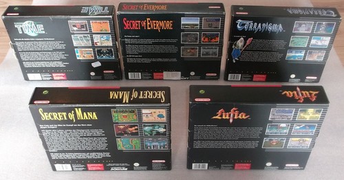 Looks like the auction has Secret of Mana, Secret of Evermore, Lufia, Terranigma and Isslsion of Time. The larger boxes come with a full size strategy guide / manual.