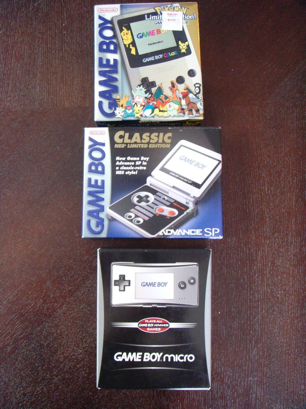 Factory Sealed Game Boy Systems – Game Boy Color Pokemon Limited Edition (color changing gold/silver), Game Boy Advance SP Classic NES Limited Edition, Game Boy micro (silver)
