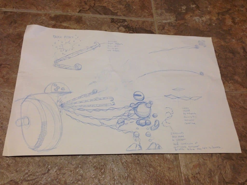 The first sketch has concept designs for Vectorman’s helmet. The second displays an idea for an attack. The sketches aren’t quite mint (as usually happens to these sorts of items). They have minor wrinkles.