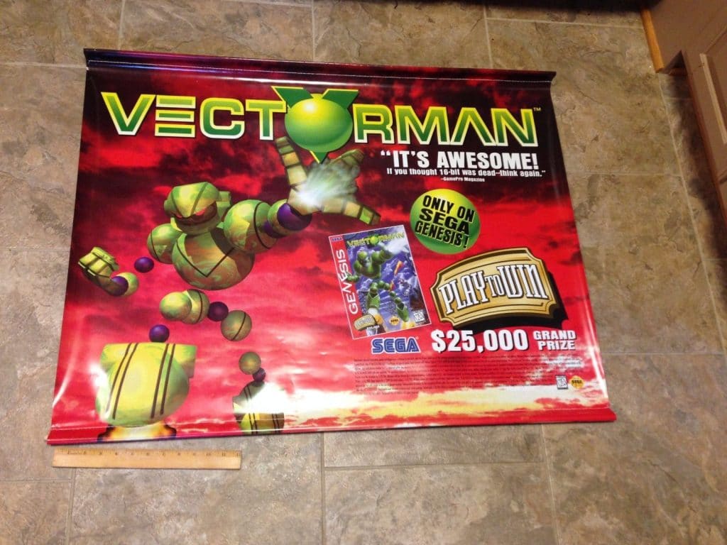 - Ultra Rare Vectorman Sega Genesis Promotional Promo Vinyl Banner – Particularly rare Vectorman vinyl banner used to promote game’s release. Includes details of the game’s play to win competition.